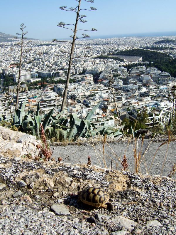 Schildkröte mit tollem Ausblick auf die Stadt.