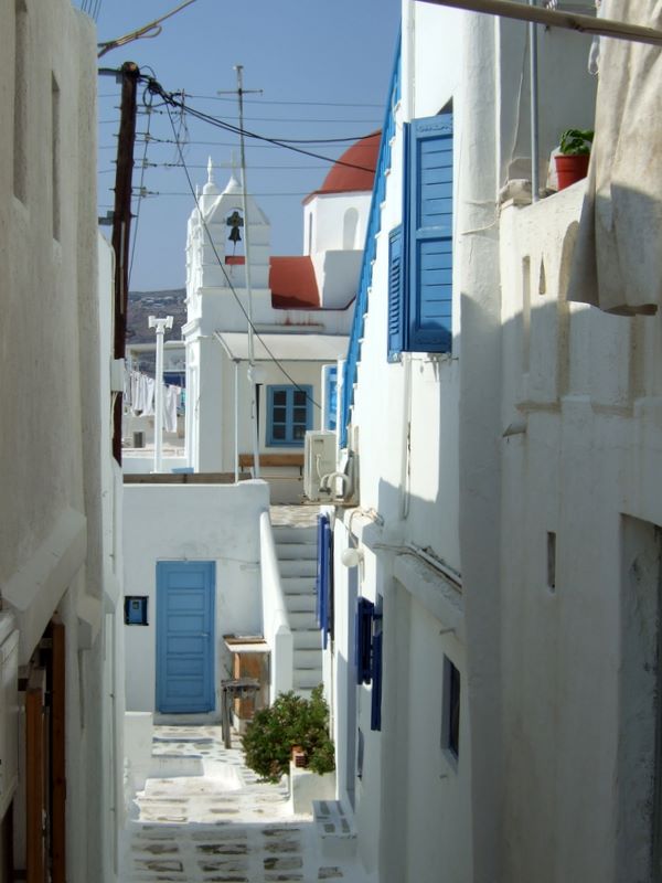 Die typischen weißen quadratischen Häuschen mit blauen Türen.